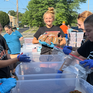 With so much help, the regular volunteers put the volleyball players right to work behind the scenes packaging over 3,000 pounds of food for future distributions.